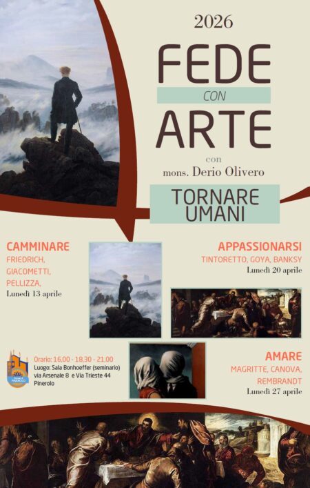 «Siamo in un’epoca in cui si parla molto di transumanesimo, postumanesimo e metumanesimo. Sono correnti di pensiero che cercano di rileggere l’umano con parole nuove, facendo riferimento a valori diversi da quelli su cui abbiamo camminato per secoli. Alcune proposte arrivano persino a mettere in discussione la centralità dell’uomo, rischiando di sminuirne la bellezza e la grandezza. D’altra parte, anche noi cristiani spesso fatichiamo a esprimere in modo rinnovato la forza culturale del cristianesimo e a dire con chiarezza che cosa esso proponga per l’umano. In questo contesto complesso, il percorso “Tornare umani” intende soffermarsi su tre dimensioni fondamentali dell’esistenza: il camminare, l’appassionarsi e l’amare, lasciandosi guidare anche dall’arte». Così il vescovo Derio introduce il tema del nuovo ciclo di incontri “Fede con arte”, che partirà il prossimo 13 aprile nella Sala Bonhoeffer del Seminario di Pinerolo.