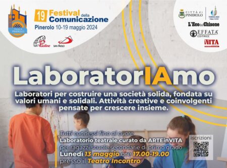 Il Festival della Comunicazione in programma a Pinerolo a partire dal 10 maggio 2024 prevede anche alcuni appuntamenti laboratoriali. I laboratori del Festival della Comunicazione 2024 a Pinerolo dal 10 al 19 maggio. Lunedì 13 maggio TUTTI CONNESSI FINO AL CUORE ore 17-19 Teatro Incontro con ARTEinVITA, Associazione Culturale che si occupa di portare […]