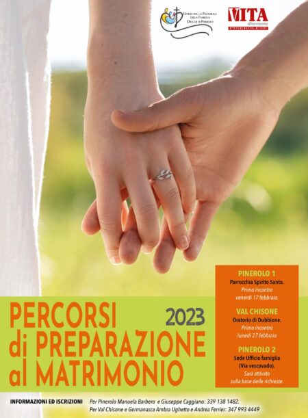 Sono in partenza i corsi diocesani di preparazione al matrimonio: presso la parrocchia Spirito Santo (Pinerolo) il 17 febbraio 2023, a Dubbione il 27 febbraio. L’Ufficio Famiglia diocesano comunica la proposta di due corsi di preparazione al sacramento del Matrimonio. Pinerolo, Val Chisone e Ufficio Famiglia Il primo prenderà il via a Pinerolo […]
