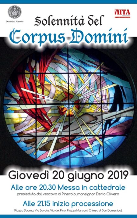 Giovedì 20 giugno alle ore 20.30 a Pinerolo nella Cattedrale il vescovo Derio Olivero presiede la celebrazione eucaristica nella solennità liturgica del Corpus Domini. Seguirà, con inizio alle 21:15, la processione con questo itinerario: piazza San Donato, via Savoia, via del Pino, piazza Marconi. La conclusione è prevista nella chiesa di San Domenico.