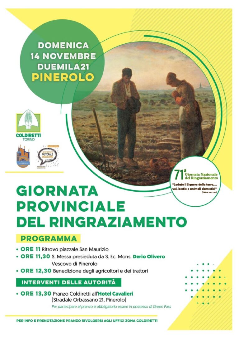 Per la prima volta la Giornata Provinciale del Ringraziamento si terrà a Pinerolo il 14 novembre: ritrovo alle ore 11 davanti alla Basilica di San Maurizio dove alle ore 11,30 la Santa Messa sarà presieduta da S.Ec.Mons. Derio Olivero, Vescovo di Pinerolo. A seguire ci sarà la Benedizione degli agricoltori e dei mezzi agricoli e gli interventi delle autorità. Presso l’Hotel Cavalieri si terrà il tradizionale pranzo Coldiretti (presso le cui sedi di zona è possibile prenotarsi, ricordando la necessità del green pass). L’Ufficio diocesano di Pastorale Sociale e del Lavoro, non può che ringraziare, insieme alla collaborazione della Parrocchia di San Maurizio, per la disponibilità della Coldiretti provinciale, nella persona del Presidente e Vice Presidente e del Direttore provinciale, l’ufficio stampa per la parte grafica, le sezioni pinerolesi, la segreteria territoriale di Pinerolo per aver reso possibile questo evento importante per rimarcare l’attenzione verso un mondo, quello agricolo, fondamentale per quell’ecologia integrale delineata da Papa Francesco nella “Laudato Si” e la cura e lo sviluppo stesso dei territori. Dal colle di San Maurizio si vuole dare a tutti gli agricoltori della Provincia di Torino che convergeranno, il più cordiale benvenuto ricordando le parole iniziali del Messaggio dei Vescovi italiani per la 71° Giornata Nazionale del Ringraziamento: “Quando lo sguardo dell’umanità si posa sulla creazione e il suo cuore trabocca di meraviglia per l’opera di Dio, la persona non può fare a meno di lodare il Signore per il dono degli animali, anzi la sua parola si intreccia con quella muta di tante creature viventi che accompagnano la nostra presenza sulla terra”