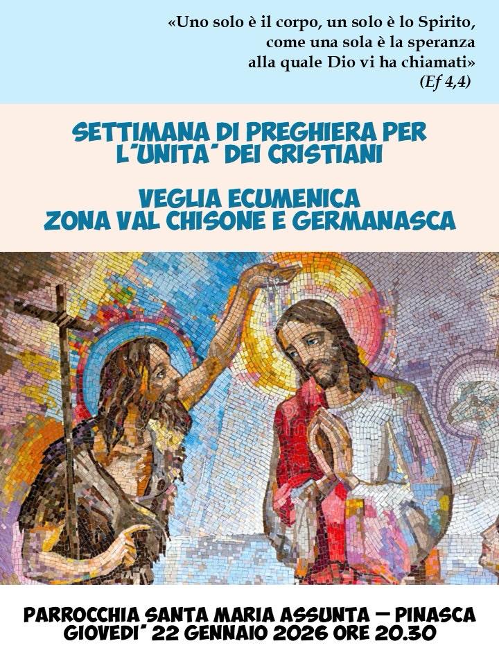 In occasione della Settimana di preghiera per l’unità dei cristiani, giovedì 22 gennaio 2026 alle ore 20.30 la parrocchia di Santa Maria Assunta a Pinasca ospiterà la veglia ecumenica della zona Val Chisone e Germanasca. L’incontro si inserisce nel cammino comune delle Chiese cristiane, chiamate a riscoprire la comunione come dono dello Spirito e come speranza condivisa, alla luce della parola biblica scelta per quest’anno: «Uno solo è il corpo, un solo è lo Spirito, come una sola è la speranza alla quale Dio vi ha chiamati» (Ef 4,4). La veglia sarà un momento di ascolto, silenzio e preghiera, aperto a tutti, per testimoniare insieme il desiderio di unità nella diversità.