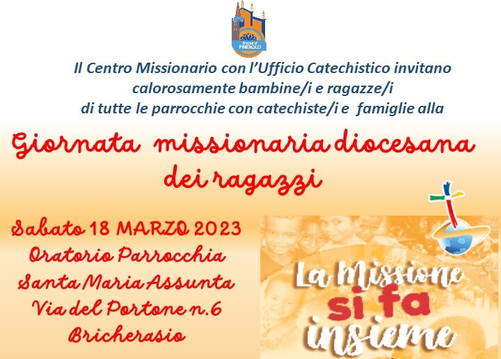 In pieno Sinodo il motto della 7° Giornata Missionaria Diocesana dei Ragazzi, che si svolgerà sabato 18 marzo presso l’Oratorio della Parrocchia di Bricherasio, è “La missione si fa insieme”. Un pomeriggio per riflettere in allegria su valori come pace, fratellanza, accoglienza, custodia del Creato, con la partecipazione di bambini e ragazzi delle Parrocchie della Diocesi insieme ai loro genitori e a catechiste e catechisti.