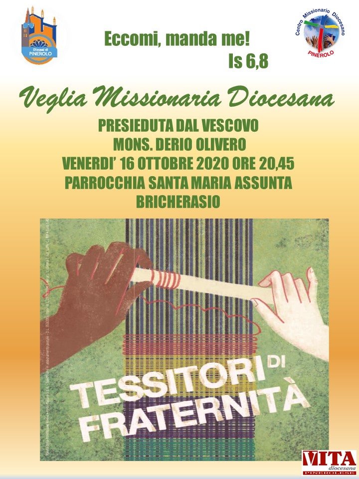 Saremo uniti nella preghiera durante la veglia missionaria diocesana, guidata dal Vescovo Derio, che si terrà quest’anno nella Parrocchia di Santa Maria Assunta a Bricherasio venerdì 16 ottobre alle ore 20,45. Domenica 18 ottobre ricorre la Giornata Missionaria Mondiale in cui la nostra solidarietà potrà dare segni tangibili di condivisione e fraternità, anche grazie al contributo per il sostegno alle chiese sorelle che operano nel sud del mondo.