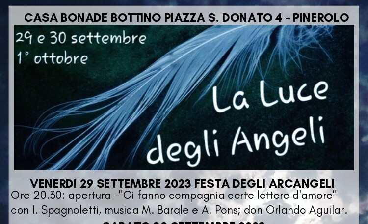Presenti e operanti nell’Antico e nel Nuovo Testamento, nel corso della storia gli angeli sono diventati un punto di riferimento non solo religioso ma anche culturale, in particolare per la letteratura e per l’arte. In occasione delle due ricorrenze liturgiche dedicate rispettivamente agli arcangeli Michele, Gabriele e Raffaele (29 settembre) e a gli angeli custodi (2 ottobre) una cordata di realtà del territorio propone a Pinerolo un ricco programma di eventi nei locali della storica Casa Bonadè Bottino (Piazza San Donato, 4).