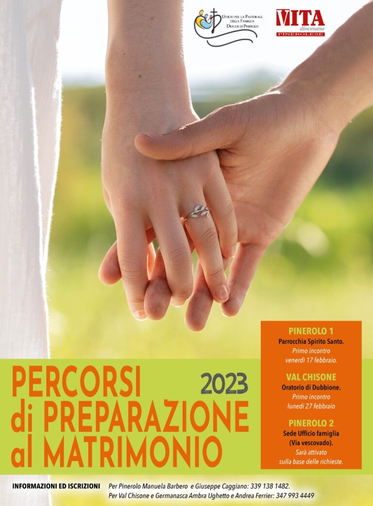 Sono in partenza i corsi diocesani di preparazione al matrimonio: presso la parrocchia Spirito Santo (Pinerolo) il 17 febbraio 2023, a Dubbione il 27 febbraio.